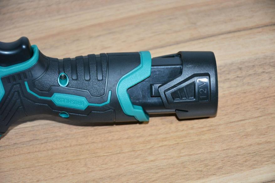 Будучи установленным в инструмент аккумулятор является продолжением его рукоятки и в готовом к использованию виде габариты шуруповерта составляют всего 5,1*15,9*18,0 см. По сути рукоятка является наиболее габаритной частью шуруповерта. Применение бесщеточного двигателя сделало шуруповерт компактным и легким. При этом тут имеются все атрибуты серьезного инструмента: обрезиненная рукоятка, кнопка с плавной регулировкой оборотов, переключатель направления вращения вала, подсветка рабочей зоны, индикатор уровня заряда аккумулятора и корпус из крепкого пластика с обрезиненными секторами.