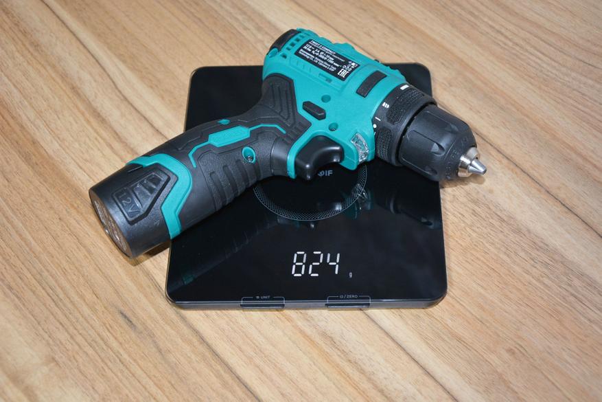 Биты сами по себе не магнитные, но саморезы держатся на них уверенно и можно особо не переживать, что при сборке мебели крепеж придется искать под ногами. Шуруповерт в руке лежим удобно, развесовка хорошая, а главное — вес небольшой. Всего 824 грамма, из которых 700 весит тушка. С таким вряд ли устанешь, даже работая где-то под потолком на вытянутой руке.