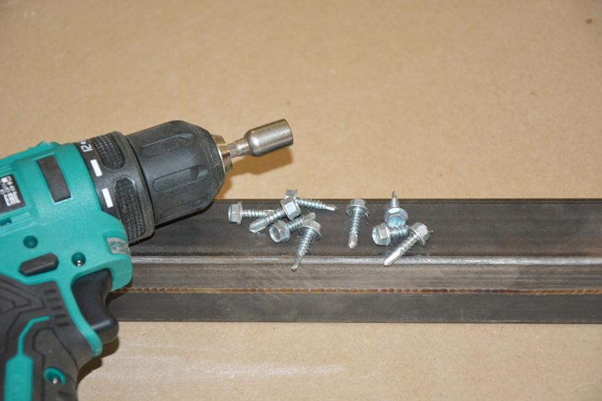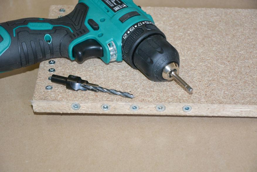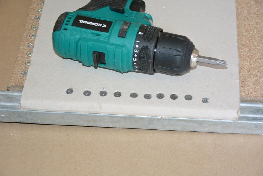 Далее были саморезы со сверлом, какие часто применяются для крепления всяких крючков, направляющих, петель и многого другого в современной мебели. Селектор крутящего момента сначала установил на 3. Важно было, чтобы шуруповерт вовремя остановился и не рассверливал отверстия в ДСП, иначе держаться фурнитура уже не будет как следует. При углублении саморезов до шляпки, как и положено, начинала срабатывать трещотка.