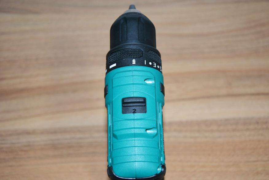 Сверху расположен переключатель скоростей вращения вала. В первом положении скорость регулируется кнопкой пуска в диапазоне 0-300 об/минуту, во втором от 0 до 1300. Муфта регулировки крутящего момента имеет 21 позицию для шуруповерта и одну для режима дрели. Производитель рекомендует придерживаться следующих диапазонов регулировки момента для разных материалов при работе шуруповертом:
