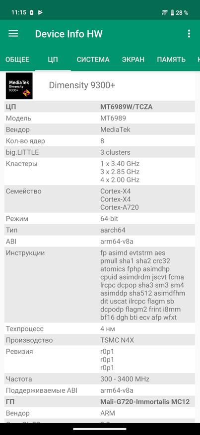 | Центральный процессор | MediaTek Dimensity 9300+ (8ядер, 4нм) |