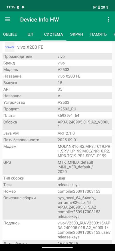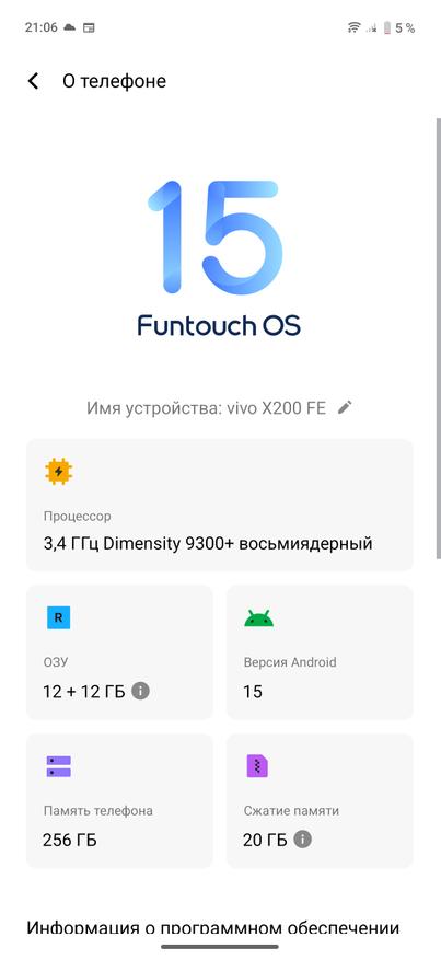 vivo X200 FE работает под управлением Android 15 с фирменной оболочкой Funtouch OS 15. Оболочка лаконичная и с малым количеством стороннего ПО (всё удаляется). При первом включении доступно минорное обновление на ~500 Мб с различными улучшениями стабильности.