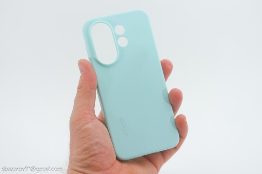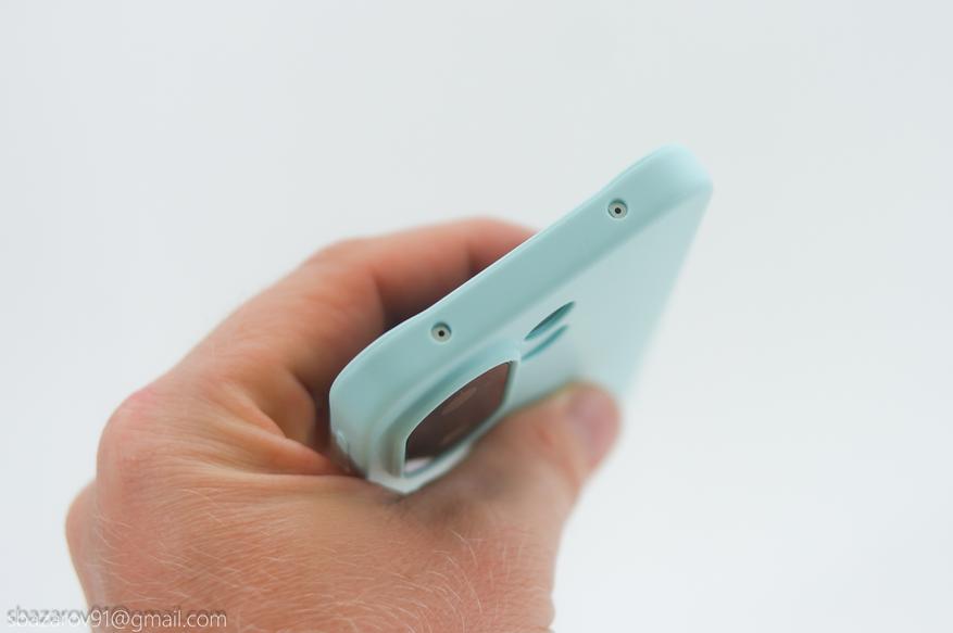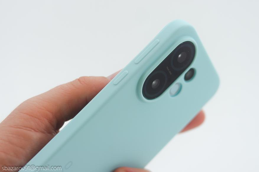 Чехол из TPU (термопластичный полиуретан) имеет приятный бледно-бирюзовый оттенок, который удачно дополняет смартфон, защищая все разъёмы и массивный блок камер.