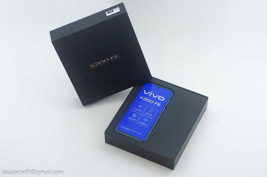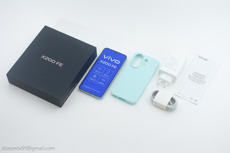 Под верхней крышкой на постаменте расположен сам смартфон, а все аксессуары скрыты под ним. Полный комплект состоит из смартфона vivo X200 FE, защитного чехла, зарядного устройства на 90 Вт и кабеля для передачи данных. Защитная пленка уже нанесена на экран.