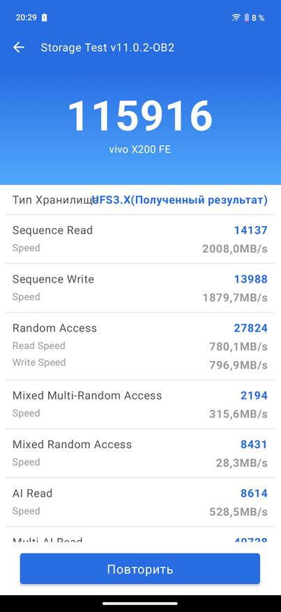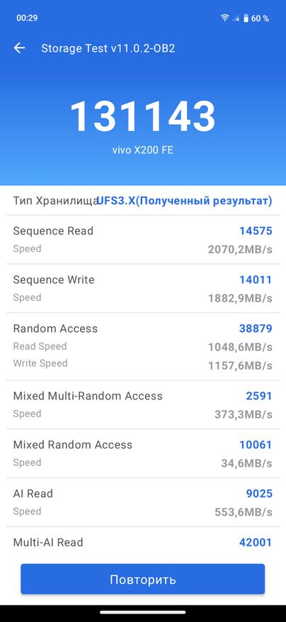 Есть ещё одна экономия: вместо шустрого UFS 4.0, который должен сопровождать Dimensity 9300+, здесь используется чуть более медленный тип накопителя UFS 3.1. Работает он всё ещё быстро и достаточен для любых задач: приложения устанавливаются моментально, видео записываются без рывков. В AnTuTu общий результат для накопителя достигает 131 тысячу очков, тогда как у UFS 4.0 это значение будет на уровне 190 тысяч.