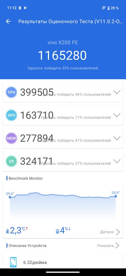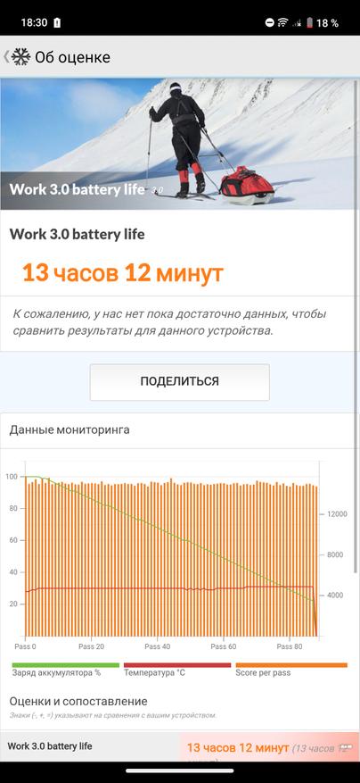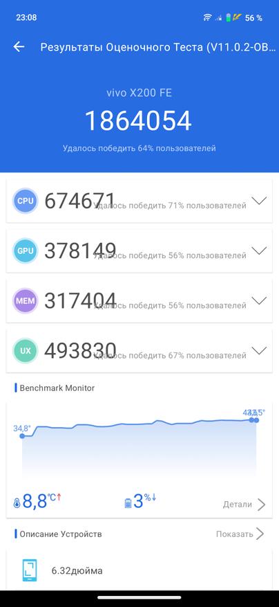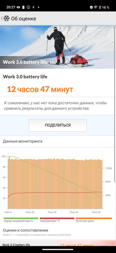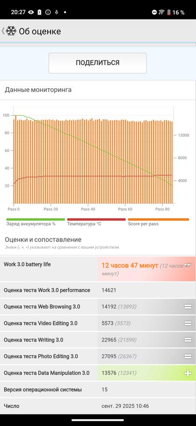 Несмотря на малые размеры корпуса, vivo X200 FE получил внушительную кремний-углеродную батарею (Si/C) на 6500 мА*ч. Это обеспечивает высокую автономность, что демонстрирует тест PC Mark: смартфон проработал 12 часов 47 минут с остатком заряда 20%. Это отличный результат, которого хватит на один световой день даже при интенсивной нагрузке, либо на 2 дня умеренной нагрузки. Если же снизить разрешение в настройках и запустить аналогичный тест, то можно получить дополнительные 25 минут ко времени работы.