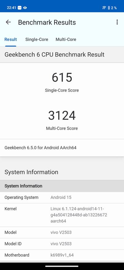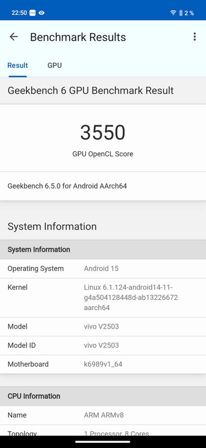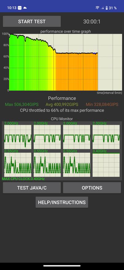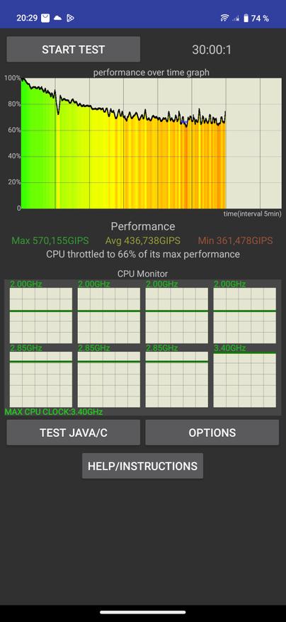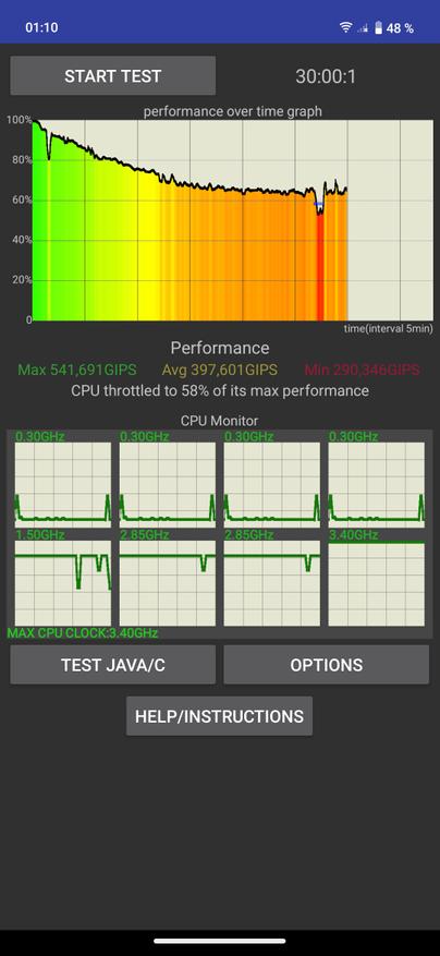 Отдельно хочется отметить работу процессора под нагрузкой. Я гонял телефон в разных условиях и играх, результат везде один — еле ощутимый нагрев корпуса и практически полное отсутствие троттлинга. Но как и в предыдущем тесте, разный процент заряда демонстрирует различные показатели общей производительности: при полном заряде 570 GIPS Max, ближе к середине 541 GIPS Max, а на минимальном заряде имеем лишь 329 GIPS Max.