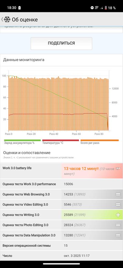 Из неочевидного: при достижении заряда менее 40-50% происходит снижение производительности вплоть до половины от общей мощности. На заряде от 50 до 100% смартфон набирает около 1,86 млн млн очков в AnTuTu и 1646/6530 очков в Geekbench 6. Как только заряд снижается, результаты становятся более скромными — 1.165 млн и 615/3124 очков, соответственно. Данный эффект не единичный и встречается у многих пользователей; возможно, он будет исправлен в будущих обновлениях.