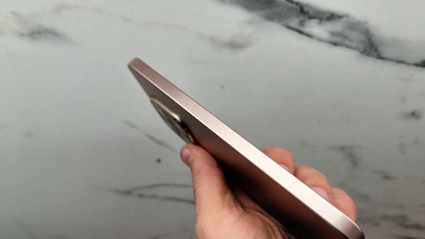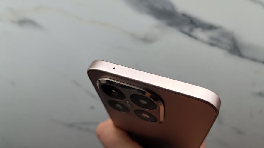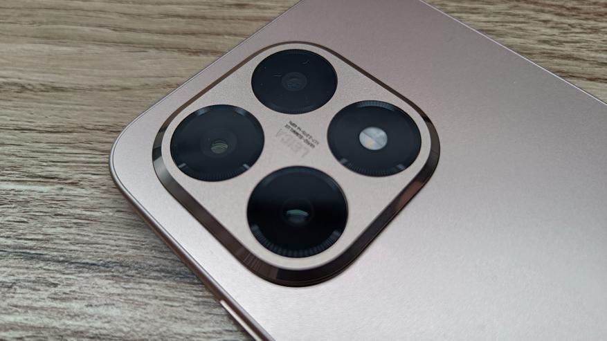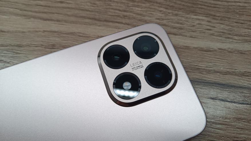 Смартфон имеет несколько расцветок, но именно розовое золото выделяется перед серебристым и черный. Тыльная часть имеет более текстурную структуру, поэтому не видны отпечатки пальцев, да и удерживать значительно проще. На тыльной стороне разместился блок 3 камер и светодиодная вспышка. Модуль камер слегка выступает из корпуса, поэтому рекомендуется дополнительная защита. Между камерами можно увидеть надпись Leica и характеристики основной камеры.