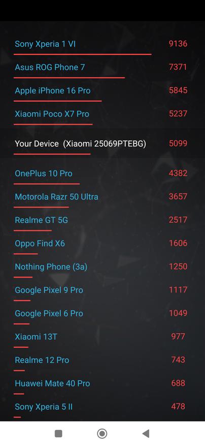 Смартфон работает на Dimensity 8400 Ultra, который показывает стабильные результаты в различных синтетических тестах и сопоставим с флагманскими «камнями» прошлого года. В сравнении с топовой версией Xiaomi 15T Pro конечно же проигрывает.