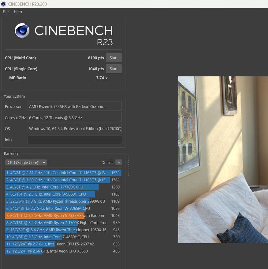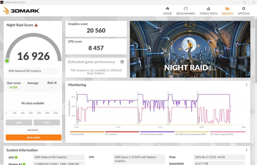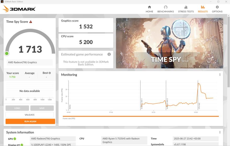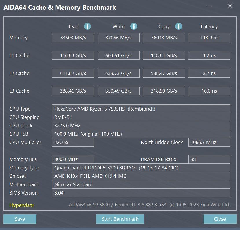 Процессор 7535HS от AMD выпуска 2023 г. по технологии 6 нм. Частота от 3,3 ГГц до 4,55 ГГц. Работает в паре с базовой встроенной графикой Radeon 660M. Распаянная ОЗУ LPDDR5 6400 МГц (чипы от RaySon) работает в двухканальном режиме.