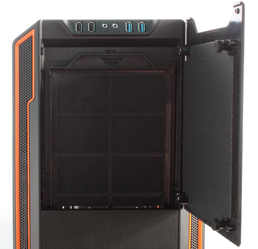 Под передней панелью имеются посадочные места для двух 120 мм или 140 мм вентиляторов. Нижний установлен с завода — вентилятор be quiet! Pure Wings 2 140mm. Он основан на подшипнике скольжения с винтовой нарезкой и крепится к шасси через резиновые колечки, для гашения вибраций. Pure Wings 2 140mm работает тихо даже на максимальных оборотах.