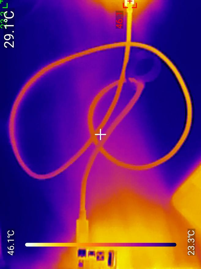 L709 протестирован с адаптерами различной мощности от 30W до заявленных 140W. Кабель корректно согласовывает параметры с подключаемыми гаджетами, обеспечивая максимально возможную скорость пополнения батареи. При максимальной нагрузке температура коннекторов поднимается до 47°C согласно тепловизионным измерениям (UNI-T UTI260M) — вполне безопасный уровень.