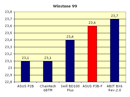 Ничего необычного на диаграммах не видно. Как того и следовало ожидать, производительность ASUS P3B-F находится на среднем уровне как по тестам, использующим офисные приложения, так и по тесту игровым приложением.