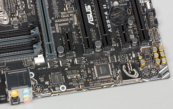 Аудиоподсистема платы Asus X99-A II имеет маркетинговое название Crystal Sound. Она включает в себя популярный HDA-аудиокодек Realtek ALC1150, который закрыт металлических кожухом. Все элементы аудиотракта изолированы на уровне слоев PCB от прочих компонентов платы и выделены в отдельную зону.