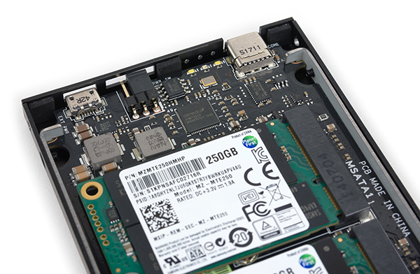 Внутри металлической коробочки скрывается плата с двумя разъемами mSATA, в которые установлены SSD-накопители Samsung MZ-MTE250 емкостью по 250 ГБ. Но самое главное, что эти два SSD-накопителя объединены в RAID-массив уровня 0.