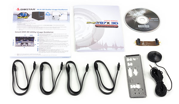 Материнская плата Biostar Hi-Fi Z87X 3D поставляется в довольно компактной картонной коробке, которая типична, скорее, для бюджетных решений. На коробку методом ламинации нанесено название и логотипы поддерживаемых технологий. В комплект поставки, кроме самой платы, входит традиционная заглушка на заднюю панель, четыре SATA-кабеля (разъемы с защелками), мостик CrossFireX, компакт-диск с утилитами и драйверами, руководство пользователя (только на английском языке) и выносной микрофон для калибровки аудиотракта. Собственно, если не считать калибровочного микрофона, то комплектация этой платы вполне типичная и довольно скромная.