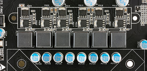 Как и большинство плат, модель Biostar Hi-Fi Z87X 3D имеет 24-контактный и 8-контактный разъемы для подключения блока питания. Регулятор напряжения питания процессора на плате Biostar Hi-Fi Z87X 3D является 12-канальным и основан на 6-фазном PWM-контроллере Intersil ISL6376. Для реализации двух каналов питания на одной фазе используются шесть удвоителей фаз Intersil ISL6611A c интегрированными MOSFET-драйверами, которые расположены на тыльной стороне платы. Сами каналы питания построены с использованием дискретных MOSFET-транзисторов.