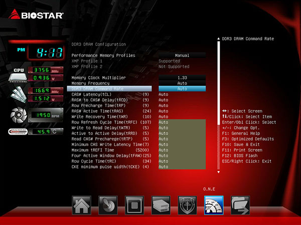 Для разгона процессора и памяти предназначена вкладка O.N.E., в которой доступны еще четыре вкладки: CPU Configuration, DRAM Configuration, Voltage Configuration и Biostar Memory Insight. Изменение частоты работы процессора и настройка режим Turbo Boost производится на вкладке CPU Configuration.