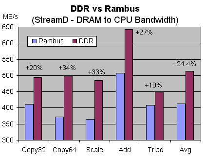 StreamD — признанный индустрией тест, оценивающий эффективную пропускную способность шины памяти. Результаты вряд ли нуждаются в комментариях и как бы анонсируют все последующие результаты, полученные на приложениях, используемых в реальной жизни. Эти приложения, естественно, не столь зависят от пропускной способности шины памяти. Поэтому различия между платформами RDRAM и DDR очень сильно сглаживаются, но суть дела это не меняет: DDR в реальных приложениях в среднем незначительно превосходит RDRAM.