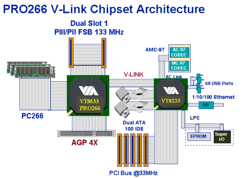 Ко все той же 133 МГц системной шине и AGP 4X добавится поддержка DDR SDRAM, а также V-Link — новой, ускоренной шины обмена информацией между северным и южным мостами чипсета, обеспечивающей пропускную способность 266 Мбайт/с (в два раза быстрее стандартной PCI). Кроме того, ожидается, что поддержка двухпроцессорных конфигураций, встроенная еще в Apollo Pro133A, станет официальной.