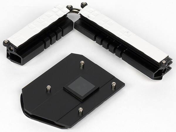 Система охлаждения платы Gigabyte GA-X170-Extreme ECC включает в себя два радиатора. Один радиатор состоит из двух частей, связанных тепловыми трубками и устанавливается по двум смежным сторонам процессорного разъема. Этот радиатор охлаждает MOSFET-транзисторы регулятора напряжения питания процессора. Еще один радиатор закрывает чипсет Intel C236.