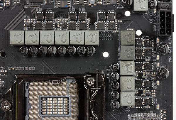 Регулятор напряжения питания процессора на плате является 11-канальным и основан на 7-фазном (4+3) PWM-контроллере Intersil 95856.