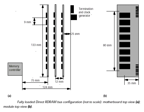 Три разъема, разделенные между собой 12-mm интервалом, берут начало от 75-mm "стартовой" секции, разделяющий контроллер и первый разъем, и заканчиваются перед 25-mm промежутком, отделяющим последний разъем от группы оконечных резисторов и формирователя синхросигналов. Основной особенностью является то, что данная структура свободна от применения последовательной нагрузки — No Stub Series Resistors. Однако, если в случае параллельной шины SLDRAM разрешается использование пустых разъемов (цепь инициализации для этого включает в цепь каждого слота расширения 1 кОм согласующий резистор, который является мостом последовательной цепочки), то в последовательной структуре RAMBus для решения проблемы распространения сигнала используются специальные продолжители канала (D-RIMM-CONT, называемые еще Dummy Module), представляющие собой печатную плату, не содержащую активных компонентов, которая должна заполнять пустой разъем и продолжать канал, не допуская разрыва в электрической цепи — последствия ставки на "неделимую" шину с последовательным интерфейсом.