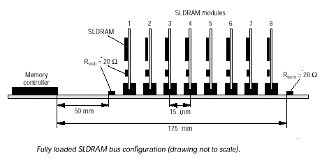 На данном промежутке возможна установка восьми нагрузок (отдельной микросхемы, если используется нерасширяемая система, или групп микросхем в составе буферизируемого по специальным правилам модуля) в специальные разъемы (SLMC — SLDRAM Module Connector) с 15mm интервалом, берущих начало на расстоянии 60mm от корпуса контроллера и заканчивающихся за 10mm до группы терминирующих резисторов. "Стартовая" секция шины (50-mm интервал) ограничивается серией 20W последовательных сопротивлений (RSTUB) за 10mm до первого соединительного ответвления, чтобы получить делитель (подробнее об этом далее).