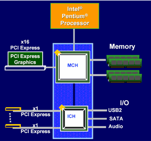Не секрет, что, начиная с 2004 года, роль стандартной графической шины общего назначения начнет играть новая универсальная (индустриальная) шина PCI-Express в 16 канальном варианте. Самый простой вариант перехода на PCI-Express для стандартных по архитектуре настольных систем выглядит вот так: