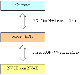 Вверху у нас система, затем 16х PCX слот, затем чип моста называемый NVIDIA «HSI» (High Speed Interconnect — высокоскоростное соединение). Чип моста соединен с графическим чипом серии NV3Х или чипом будущего поколения через его стандартные AGP выводы. Однако в случае, когда графический чип работает с HSI мостом, расположенным на минимальном расстоянии рядом с самим чипом на плате ускорителя, мы можем позволить себе двукратное увеличение скорости, на которой функционирует AGP 8х шинный интерфейс графического чипа. Таким образом, мы получаем аналог (по пропускной способности) несуществующей в виде стандарта шины AGP 16х. Следовательно, пропускная способность достигает 4 гигабайта в секунду. Но и это еще не все — если типичная система, согласно стандарту AGP, умеет передавать данные с максимальной скоростью только в одном направлении, то усовершенствованный AGP интерфейс между HSI мостом и ускорителем от NVIDIA передает данные со скоростью 4 гигабайта в секунду в обоих направлениях (!). Но, важно понимать, что не одновременно. В каждый конкретный момент времени передача идет только в одном направлении, и пиковая полоса будет всегда 4 гигабайта в секунду. Кроме того, требуется время на переключение из состояния передачи в состояние приема данных. Интересно, что чип моста является двунаправленным — при желании его можно развернуть «наоборот» и он будет выполнять функции моста для создания AGP 8х карт на основе PCX чипов, которые NVIDIA планирует начать производить через некоторое время.