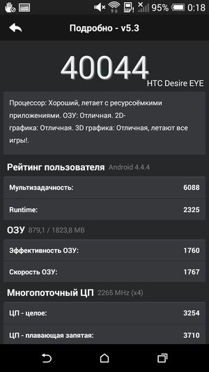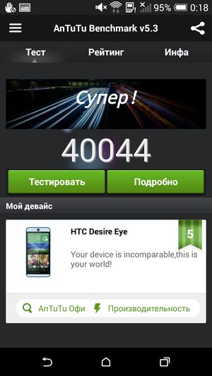 По результатам тестирования в бенчмарках смартфон с версией платформы Qualcomm Snapdragon 801 MSM8974AB ожидаемо и логично немного уступил максимальной версии MSM8974AС, у которой более высокая частота процессорных ядер и GPU (на примере сравнения с Sony Xperia Z3). Что же касается конкурирующих платформ, то в сравнении с новейшей восьмиядерной MediaTek MT6595 (представленной в сравнительной таблице моделями Meizu MX4 и Lenovo Vibe X2) SoC Qualcomm уже не занимает лидирующие позиции. Даже более слабая версия Mediatek MT6595m обгоняет Snapdragon 801 как в комплексных тестах, так и в браузерных. Впрочем, графический ускоритель Adreno 330 в Snapdragon все еще находится на первом месте по производительности, его не догнал даже новейший PowerVR G6200, который входит в состав платформы MediaTek. Как бы то ни было, аппаратная начинка смартфона HTC Desire Eye безусловно достаточно производительная для того, чтобы справиться с любыми задачами, поставленными требовательными программами и тяжелыми 3D-играми.
