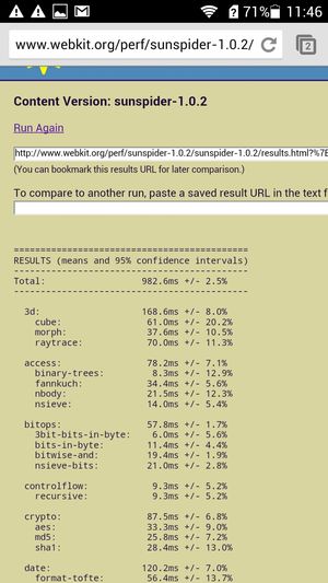 Что касается бенчмарков для оценки скорости движка javascript, то стоит всегда делать скидку на то, что в них результаты существенно зависят от браузера, в котором запускаются, так что сравнение может быть истинно корректным только на одинаковых ОС и браузерах, а такая возможность имеется при тестировании не всегда. В случае с ОС Android мы всегда стараемся использовать Google Chrome.