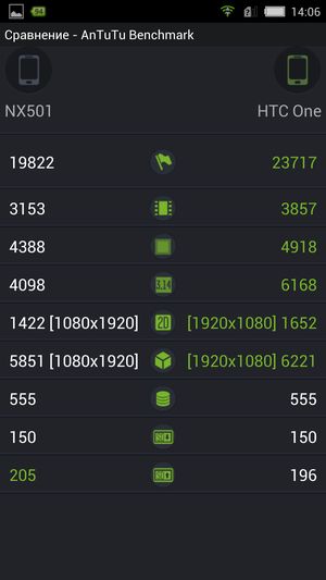 Чтобы получить представление о производительности платформы ZTE nubia Z5, перейдем к тестам. Для начала приведем сравнительные результаты, полученные при использовании базы данных самой AnTuTu. По результатам тестов производительность новинки оказалась ниже, чем у двух наиболее популярных топовых мощнейших современных смартфонов — Samsung Galaxy S4 и HTC One.