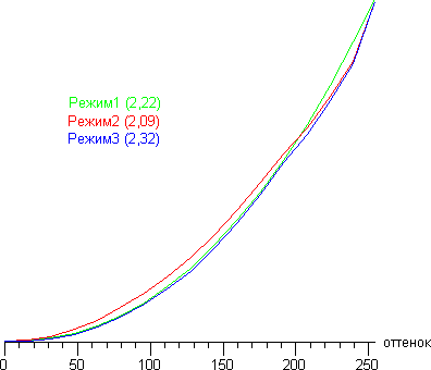 Реальная гамма-кривая ближе всего к стандартной при значении Режим1, поэтому далее мы измерили яркость 256 оттенков серого (от 0, 0, 0 до 255, 255, 255) именно при этом значении. График ниже показывает прирост (не абсолютное значение!) яркости между соседними полутонами: