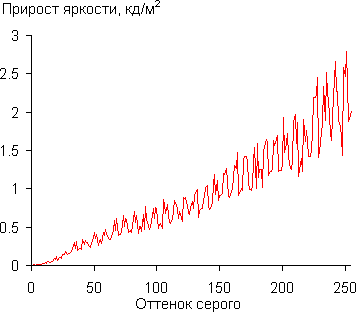Для оценки характера роста яркости на шкале серого мы измерили яркость 256-ти оттенков серого (от 0, 0, 0 до 255, 255, 255). Выяснилось, что при значении настройки Контраст = выше 50% верхняя часть гамма-кривой имеет заметный загиб, поэтому дальнейшее определение гамма-кривых и оценка качества цветопередачи выполнялись при Контраст = 50. График ниже показывает прирост (не абсолютное значение!) яркости между соседними полутонами при Гамма = Режим1.