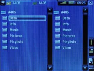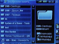 Другой способ добраться до содержимого плеера — файловый менеджер. Здесь вы можете свободно передвигаться по папкам, здесь нет ограничений на формат данных — отображается всё, что лежит в директории, даже те файлы, которые не способны проигрываться плеером. Как мы привыкли видеть у плееров других производителей, файловые менеджеры ограничиваются одним окном с деревом папок. У плееров Archos обычно два окна, подобно компьютерным файловым менеджерам типа Far или Total Commander. Таким образом, без участия компьютера можно управлять всем содержимым: копировать (по одному или все файлы из директории), вырезать, вставлять, а также переименовывать, и конечно же, удалять файлы из памяти и создавать новые папки, имена для которых можно ввести по-русски или по-английски. Для переключения между окнами менеджера есть специально отведенная для этого кнопка.
