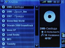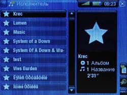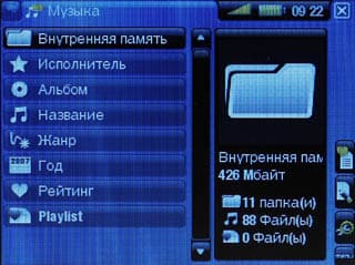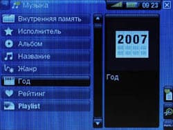 Войдя в меню Музыка главного меню плеера, мы сможем наблюдать ту самую библиотека мультимедиа ArcLib. Она состоит из семи категорий: Исполнитель, Альбом, Название, Жанр, Год, Рейтинг, Playlist. Естественно, в каждой из данных категорий музыка упорядочивается соответственно своему названию. Порой в некоторых плеерах разных производителей, где музыка каталогизируется встроенной библиотекой подобно рассмотренному выше, не хватает категорий. Здесь же их вполне достаточно для удобного поиска. Не нравится данный режим совсем — пожалуйста, есть режим файлового менеджера. Большинство моделей не могут похвастаться возможностью работы как с библиотекой, так и в «проводниковом» режиме, и за эту особенность плееру огромный «плюс» в копилку достоинств.