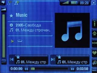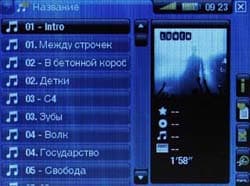 Итак, перейдем непосредственно к самому окну воспроизведения музыки. На экране во время проигрывания трека можно увидеть имя артиста, название альбома, название песни. Отображается режим воспроизведения, который, кстати, можно настроить как душе угодно с различными вариациями. Отметим полезную возможность выбрать трек для его воспроизведения сразу после текущего. Если тег файла снабжен картинкой, она отображается справа от информации о треке. Удобно, что над полосой прогресса слева и справа отображаются названия соответственно предыдущего и последующего треков. Справа и слева от полосы прогресса отображается прошедшее и оставшееся время. Уровень громкости регулируется либо специально отведенной для этого клавишей, либо кнопками «вверх» и «вниз». Около правого края экрана отображается столбик иконок, расшифровка и доступ к которым предоставляется после нажатия кнопки Menu.