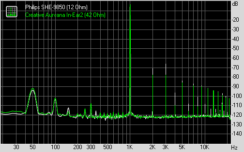 График гармонических искажений под нагрузкой наушниками Philips SHE 9850 (12 Ом) и Creative Aurvana In-Ear2 (42 Ом):