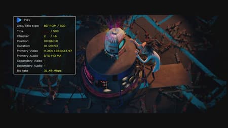 Но вернёмся к отличиям плеера при воспроизведении Blu-ray-дисков и их образов: разница бросается в глаза, во-первых, отсутствием возможности быстрой промотки. Нажимай-не нажимай кнопки со стрелками на пульте ДУ — ничего не происходит. Работает лишь опция, называемая обычно GoTo ( в нашем плеере она называется Time search, где требуется вручную ввести нужное время). Ускоренное воспроизведение в обе стороны ограничено кратностью 16х, замедленное проигрывание возможно лишь на скорости 1/2х. Сведения о видео, выводимые на экран по нажатию кнопки Info, также приобретают несколько иной вид: