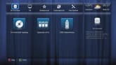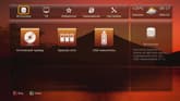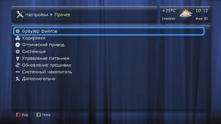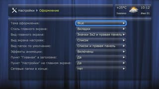 Здесь, как видим, главный браузер разбит на несколько окон, в двух из них осуществляется выбор носителя и контента, в третьем отображается текущее время и погода, а чётвёртое информационное окно содержит сведения о выбранном элементе. Внизу экрана можно наблюдать подсказку из двух пунктов. Она гласит о том, что в данной версии прошивки задействованы цветные кнопки, имеющиеся на ИК-пульте, обозначенные латинскими буквами A, B, C и D. Этими кнопками пользователь может на лету изменить способ отображения содержимого окна файлового браузера (иконки, список), а также изменить цветовую тему оформления на любую из восьми имеющихся. Перезагрузка после этого не требуется, все изменения происходят за считанные секунды.
