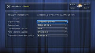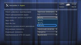 Отдельно следует отметить наличие нескольких популярных «компьютерных» разрешений экрана в видеонастройках, а также выбор режимов декодирования аудио (стерео, 5.1, 7.1) и максимальной частоты на S/PDIF (48, 96, 192 кГц).