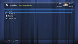 Ускоренный просмотр доступен в обоих направлениях вплоть до значений 32х, также возможно замедленное воспроизведение до 1/32х. Выбор субтитров и их настройки, а также выбор звуковой дорожки осуществляется нажатием соответствующих клавиш на пульте ДУ с последующим выбором нужного пункта из всплывающих меню.