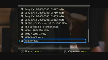 Если во время воспроизведения видеофайла нажать на пульте ДУ кнопку POPUP MENU, то на экране появится список файлов, имеющихся в текущей папке. Здесь можно быстро перейти к нужному файлу либо настроить порядок повтора воспроизведения кнопками, указанными в подсказке.