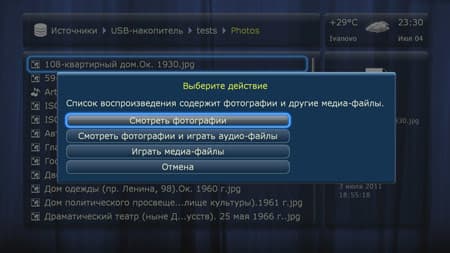 Просмотр фотографий может сопровождаться музыкой. Если в папку с фото поместить музыкальные файлы, то плеер услужливо предложит один из следующих вариантов: