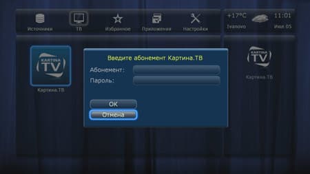 Все эти сервисы собраны в двух разделах главного меню: ТВ и Приложения. Начнём с первого. Здесь на выбор имеется два сервиса — Картина.ТВ и IPTV. С первым сервисом мы разобрались почти мгновенно, получив отлуп в виде просьбы ввести пару логин/пароль. Приобрести подписку можно на сайте сервиса http://kartina.tv, здесь доступны 120 каналов, а также широкий выбор архивных записей. Стоимость подписки составляет около 15 евро за один месяц.
