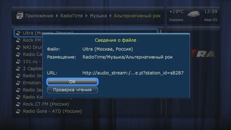 Следующий сервис — RadioTime — это онлайновая библиотека музыкальных каналов, разбитая на категории и станции. Перед воспроизведением выбранной станции пользователь может проверить её доступность в настоящий момент, нажав Проверка чтения в окне информации.