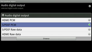 | Настройки сети. К сожалению, медиацентр отказался работать с имеющимся у нас USB-Wi-Fi-адаптером Canyon CNP-WF518N2. По этой причине проверка скорости работы беспроводной сети в данном обзоре не состоится. | Аудионастройки. На скриншоте видно, что медиацентр умеет как декодировать звук, преобразуя его в стерео PCM (downmix), так и передавать напрямую в исходном качестве посредством HDMI либо S/PDIF. |