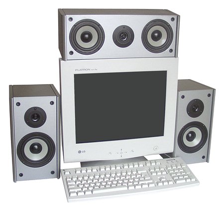 Если голые цифры вам не дают полного представления о габаритах колонок, ниже на фотографии вы можете видеть, как выглядят фронтальные и центральный спикеры рядом с 17" монитором LG Flatron.